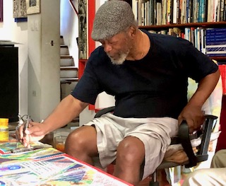 I had been around artist in Jamaica as my uncle, Lloyd Walcott, was an artist, but walking through LeRoy’s home/studio that day I knew I was in the presence of a master. Also, amazing was his ability to work and entertain — I remember him making and offering us peanut punch, playing music, chatting with others who dropped by, between the 4 hours we were there, and in the midst of all the activity and talking with us, he kept painting. The caveat of that first meeting, of what would become many, many visits, was that my friend told him that I wrote and he said I should bring some of my poems the next time I came to visit — that was before computers and cell phones.
